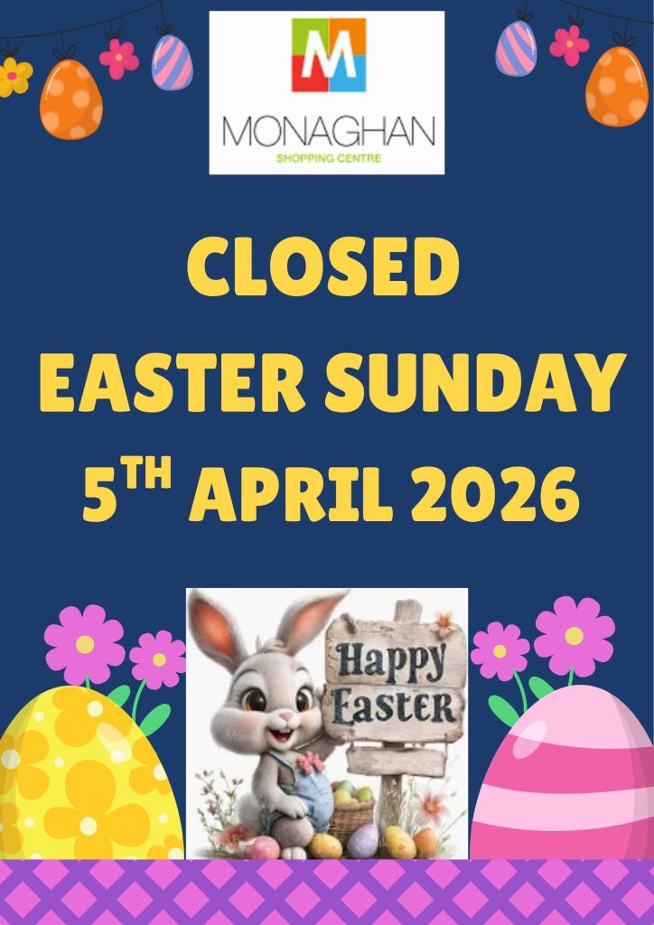 Monaghan Shopping Centre will be closed on Easter Sunday, 5th April 2026.